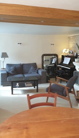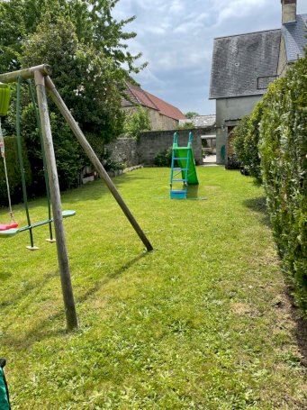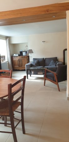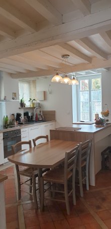 La maison se compose d’une entrée avec vestiaire et WC, d’une cuisine récente aménagée et équipée, d’un séjour-salon avec cheminée et insert.