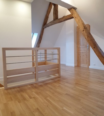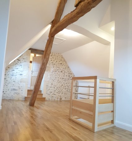 Au 2ème étage un grand palier/bureau de 20m², une chambre mansardée, une salle d’eau avec WC et un grenier de 15m² au sol.
