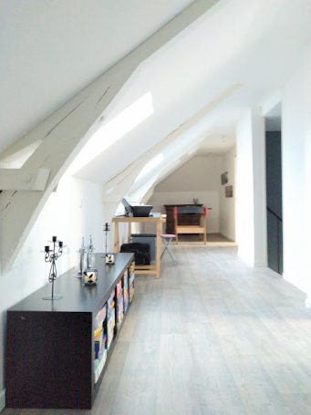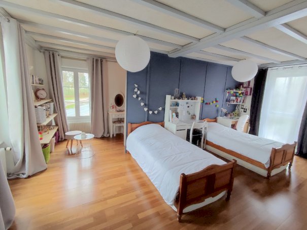 - au 1er étage : Un palier donne sur 2 chambres possédant chacune sa salle de bains privative et son dressing (dont une de 25 m² avec poutres).
