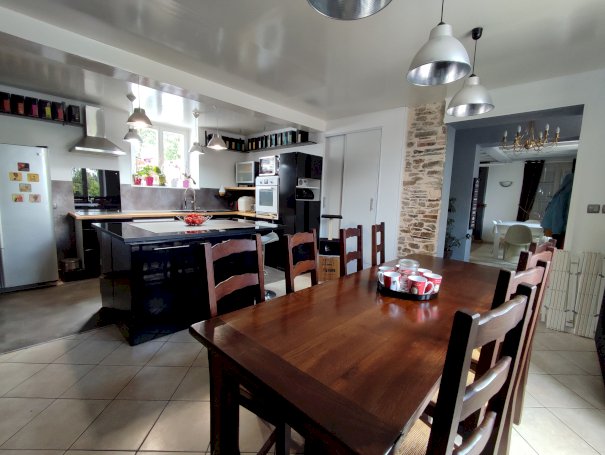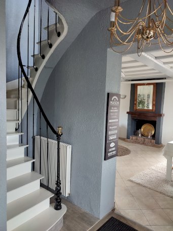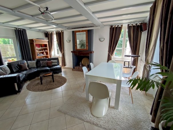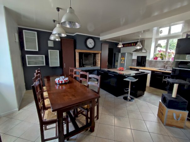 - au rez-de-chaussée : L’entrée donne d’un côté sur une cuisine aménagée et équipée ouverte sur la salle à manger avec une cheminée, de l’autre côté sur un grand salon avec cheminée et poutres ainsi que les wc.