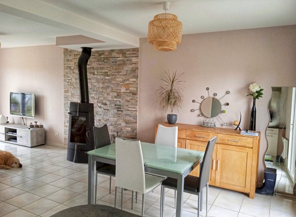 - salon/salle à manger, une cuisine équipée, un bureau, un WC, un cellier et un garage. Une grande terrasse se situe à l'arrière de la maison.