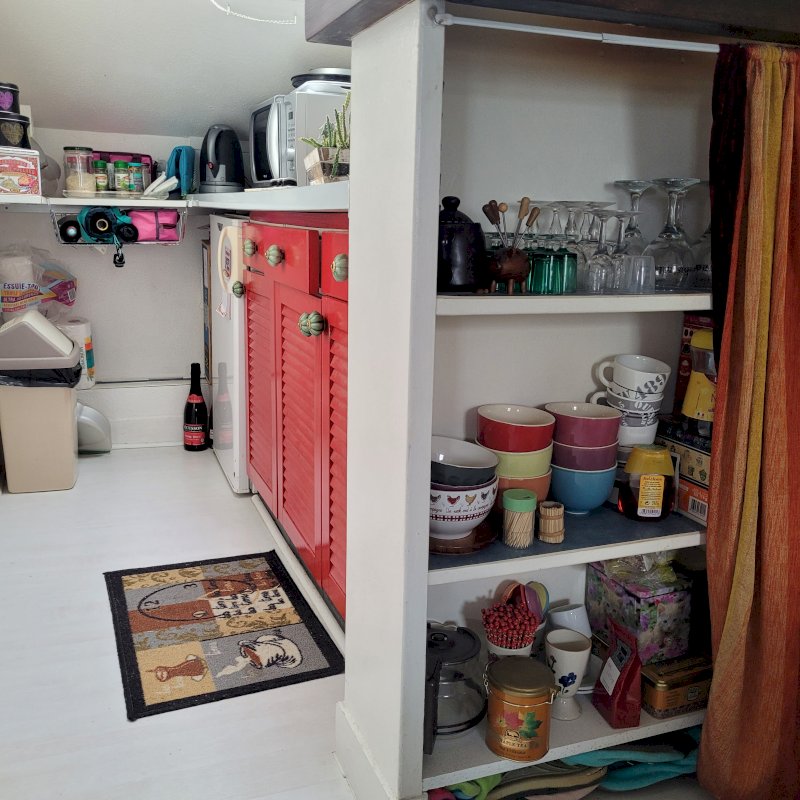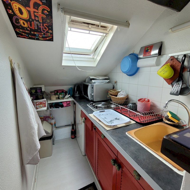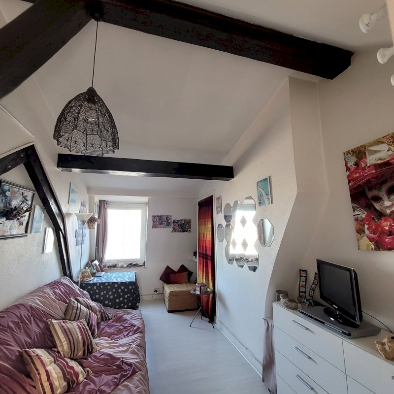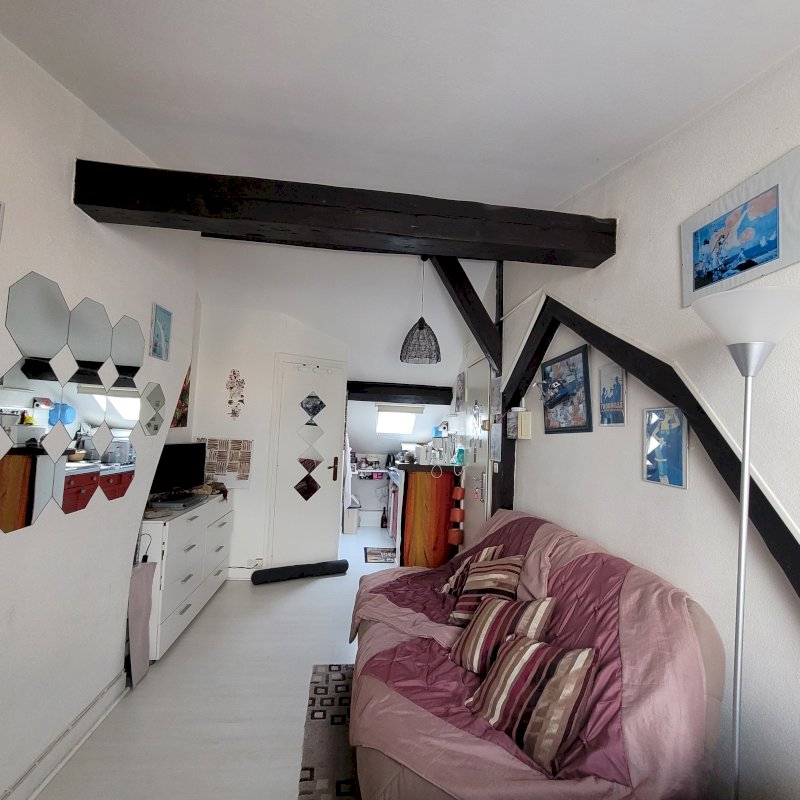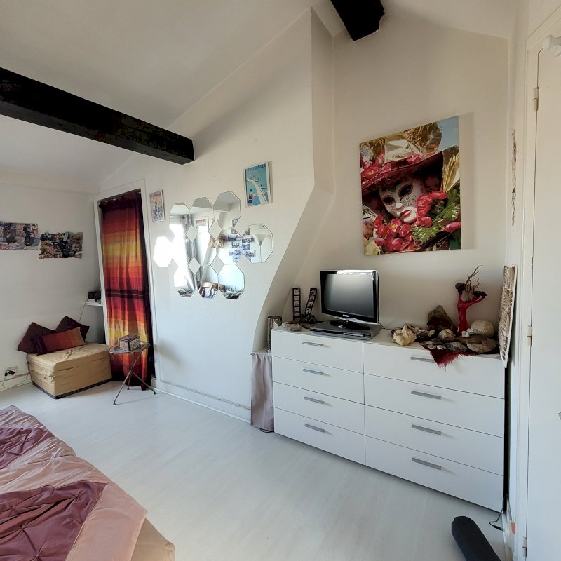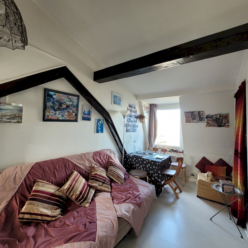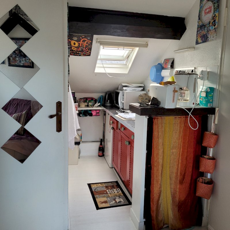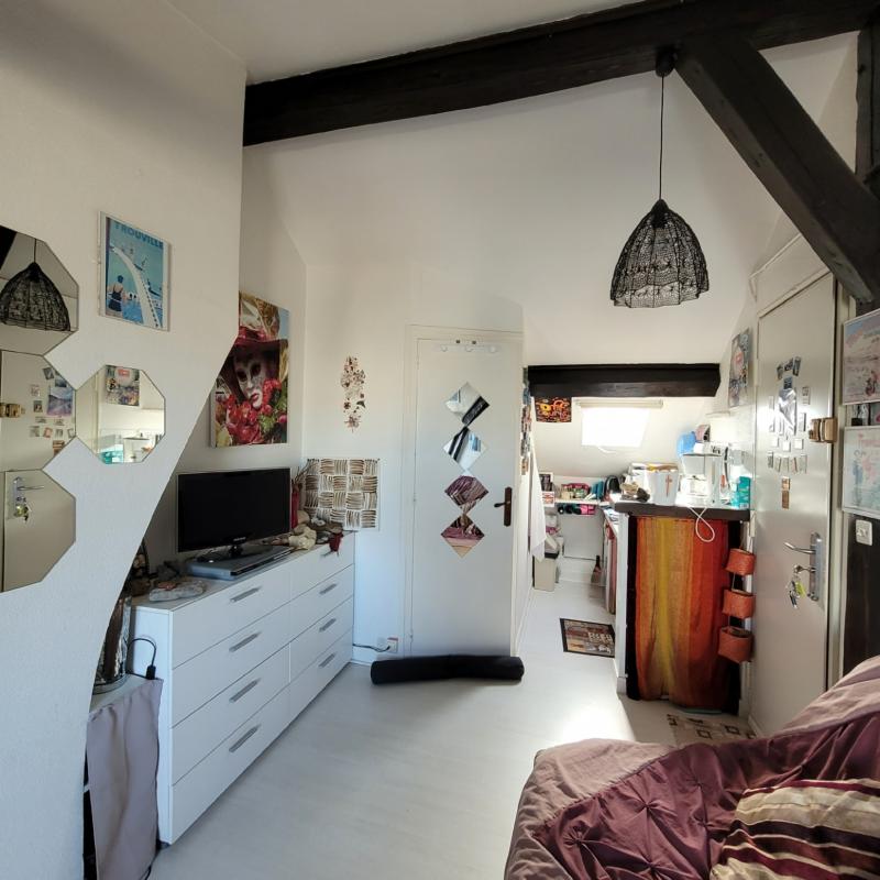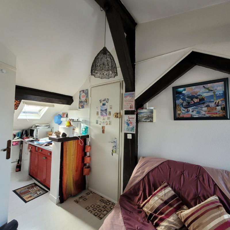 - une pièce principale, ouverte sur coin cuisine aménagée et équipée. 2 grands vélux. Parquet flottant sur dalle de béton et film isolant thermique et phonique. Placards/penderie.