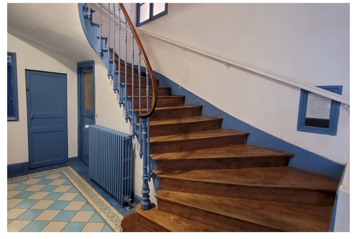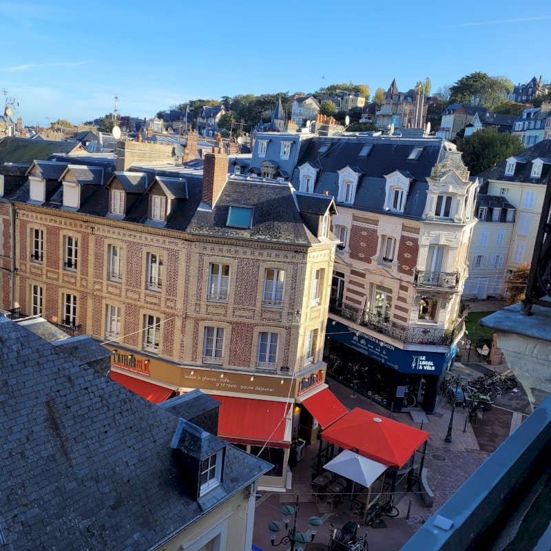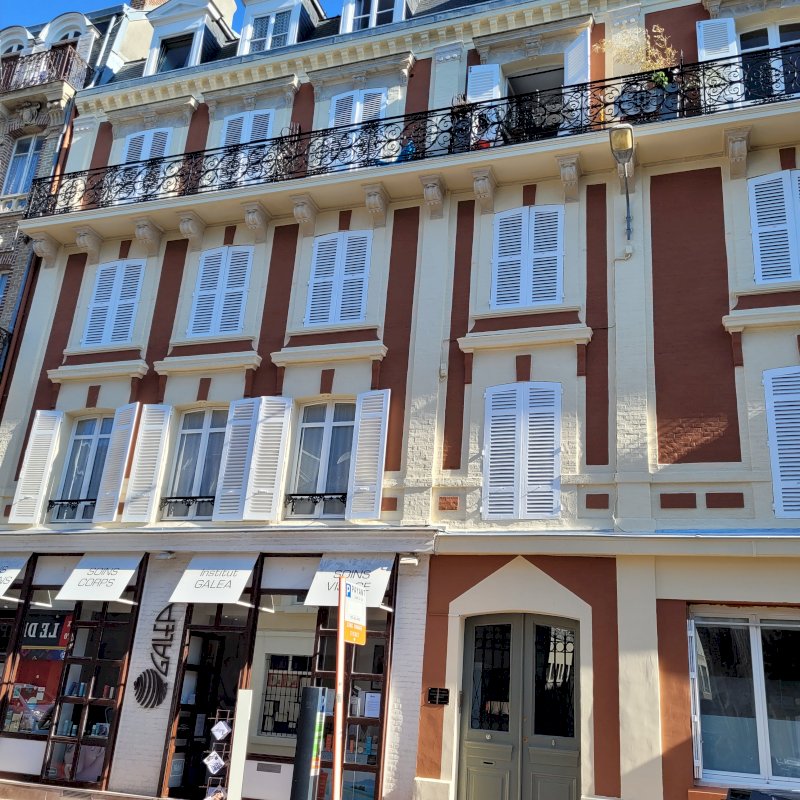 Au 4e et dernier étage d’un immeuble "classé" . Ravalement et toiture refaits et payés. Cuves pour le chauffage des parties communes et l’eau chaude, neuves. Hall d’entrée avec mosaïques d’origine, et large escalier ciré, parfaitement entretenu. Aucun vis-à-vis. Vue dégagée sur les toits et les collines de Trouville, et la Place Tivolli. Immeuble très calme.