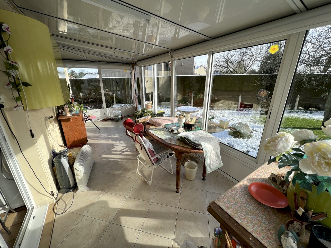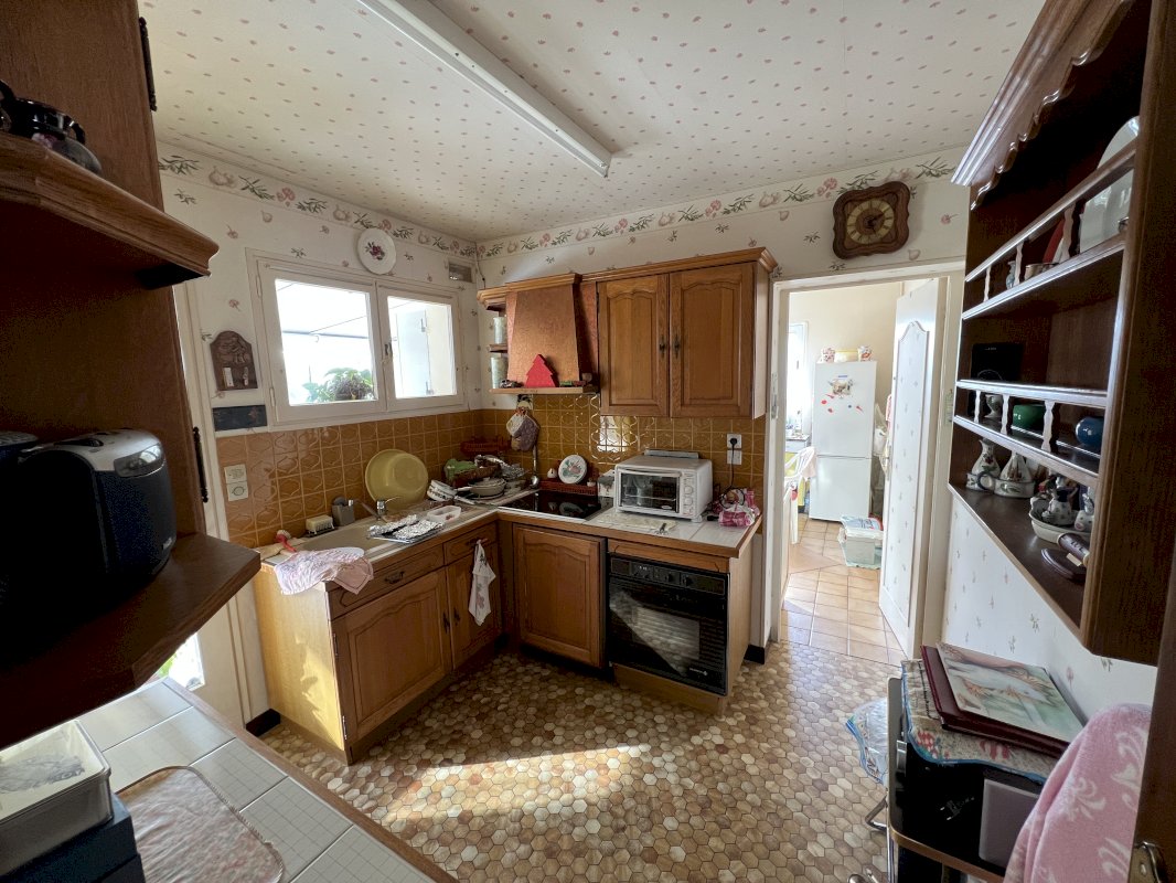 Cuisine et arrière-cuisine ouvrent sur une véranda arrière rénovée (isolation thermique en toiture, vitres coulissantes en double-vitrage et stores électriques).