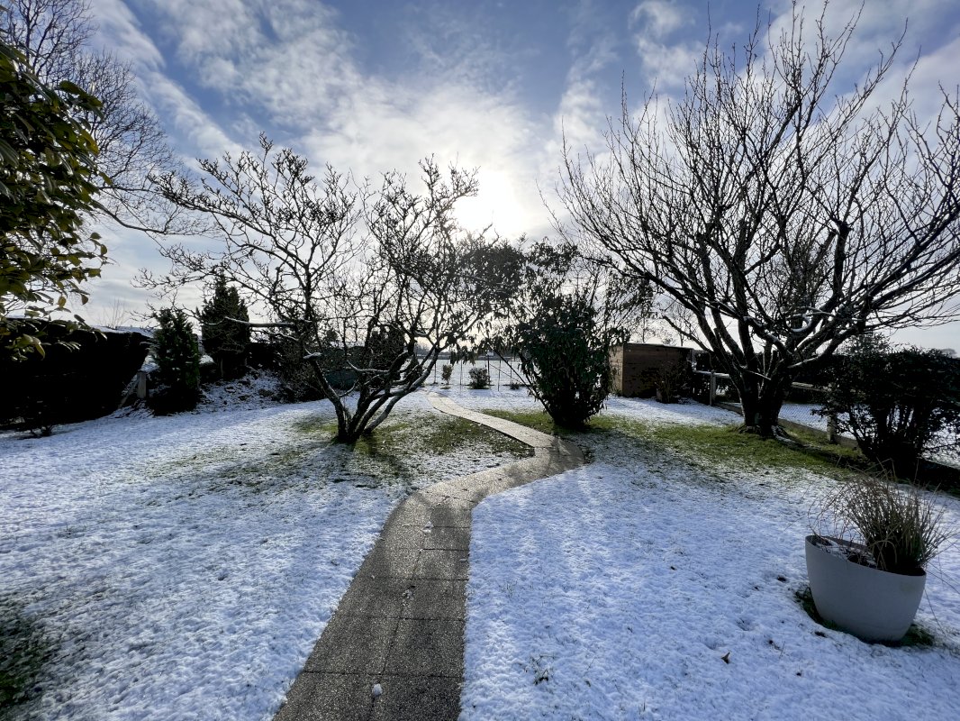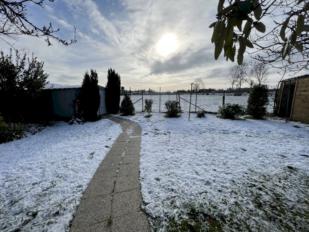 Grand jardin agréable et entretenu, avec vue arrière dégagée sur un grand pré (petit cabanon et abri de matériel de jardinage en fond de jardin).