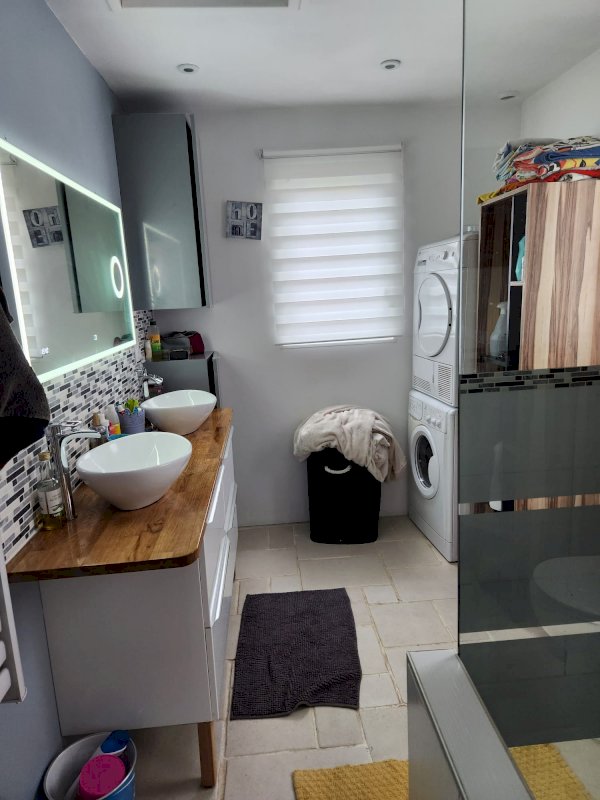 Elle se compose au rez-de-chaussée d'une entrée desservant un grand espace ouvert composé d'une double salle à manger et d'un salon de plus de 50 m2. Cuisine aménagée et équipée avec coin repas. Une chambre et une salle de douche.