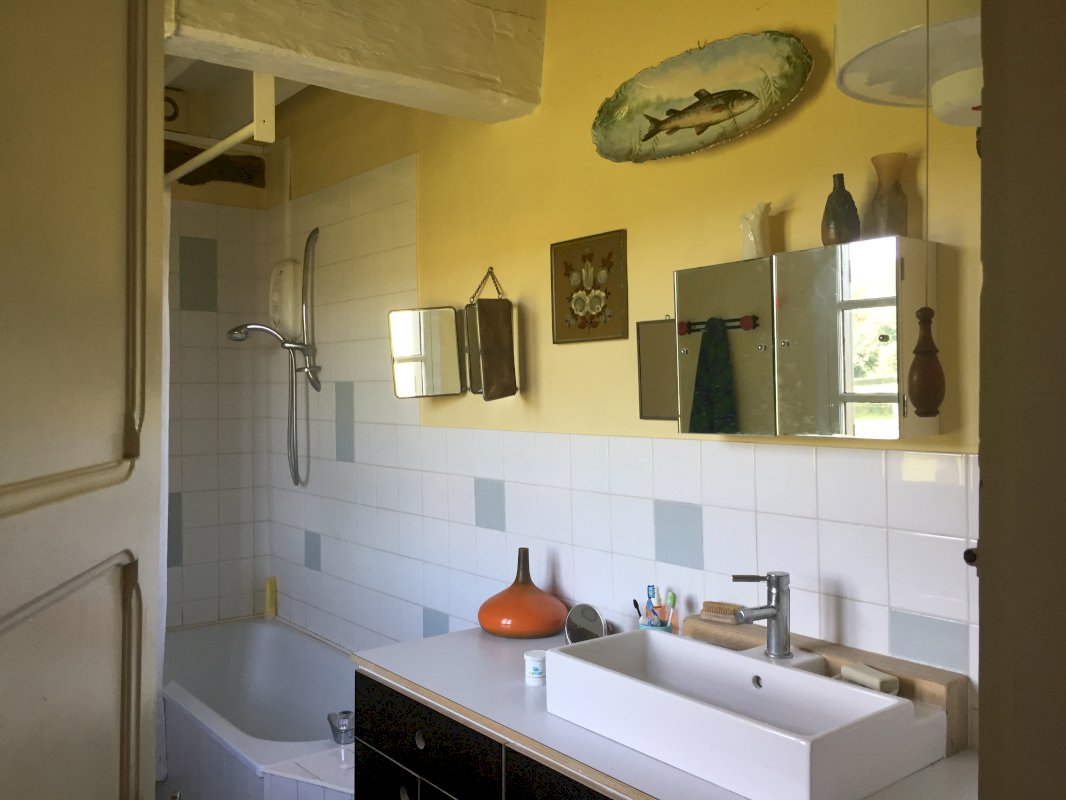 Au rez de chaussée de l’habitation une cuisine équipée avec poêle et coin repas, un salon avec un poêle une remise de cuisine avec frigo et machine à laver et une salle de bain.