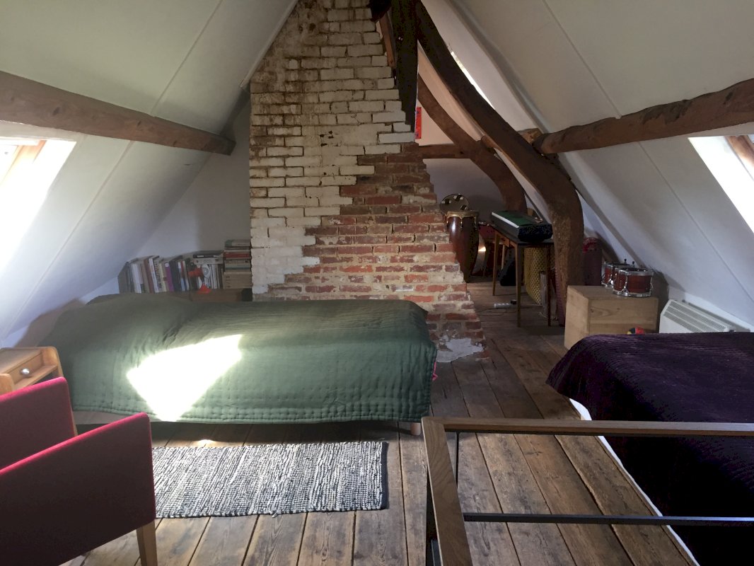 Au premier sous les toits une chambre fermée et une double chambre séparée par la cheminée.