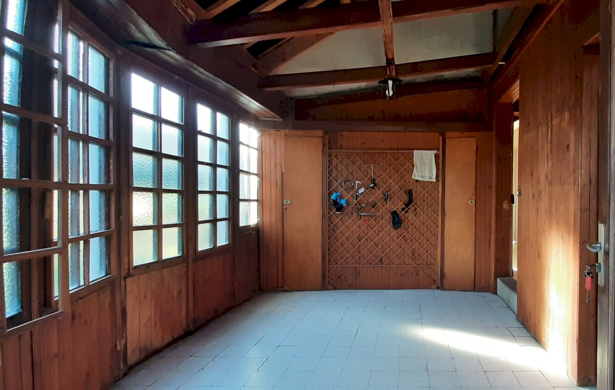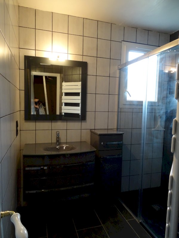 Ce logement possède un grand garage avec fosse, long pour garer en plus une remorque. Il communique avec un grand sous-sol à plusieurs compartiments.