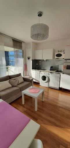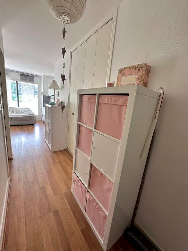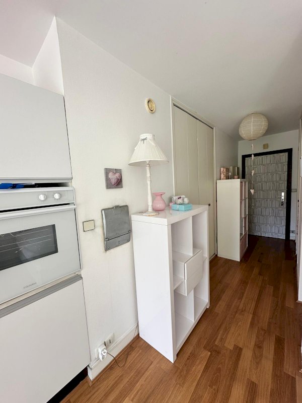 Coin cuisine aménagé et équipé, salle de bain, 2 placards jusqu'au plafond, wc séparés et terrasse donnant sur la pièce principale. Ultra lumineux du matin à l'après-midi.