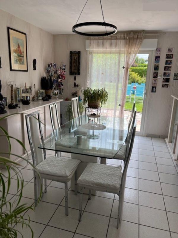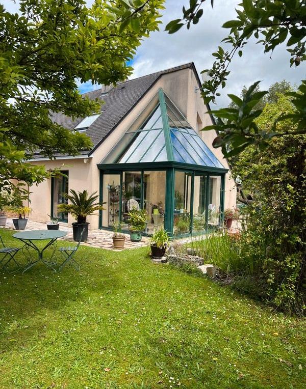 Cette maison contemporaine se situe sur un terrain clôturé et arboré ( arbres fruitiers, joli jardin, pelouse et divers arbustes). Bassin d'agrément. Serre dans le potager. Carport sur un côté de la maison.