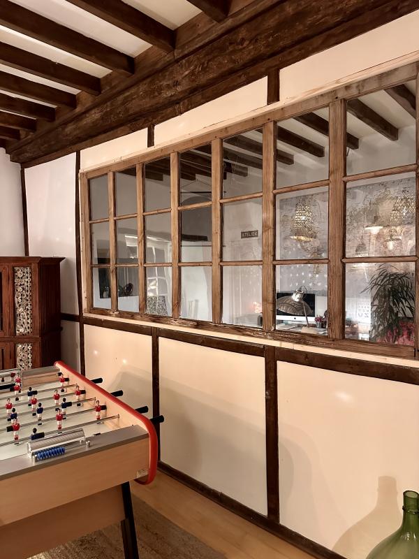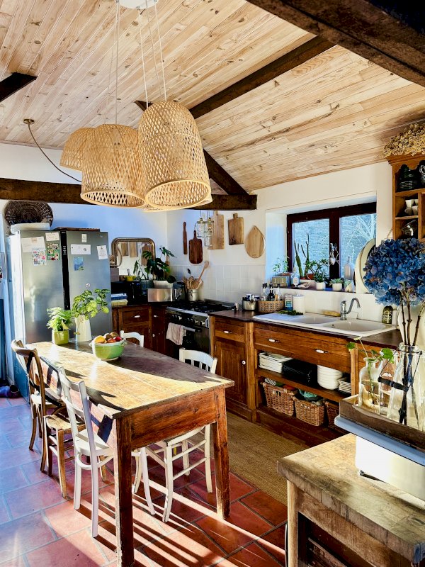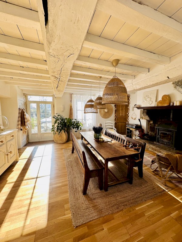 • Une grande salle à manger lumineuse avec poêle à granulés Hi-tech, parfaite pour des repas en famille ou entre amis.