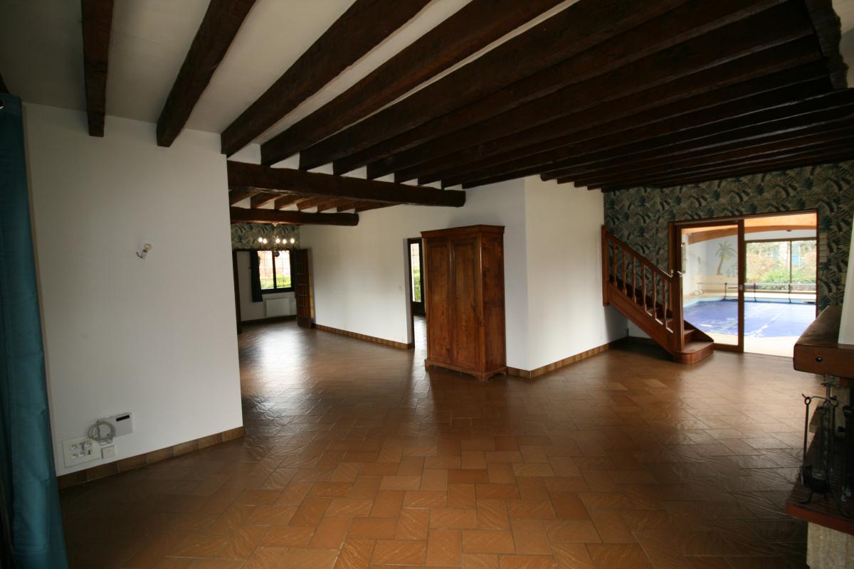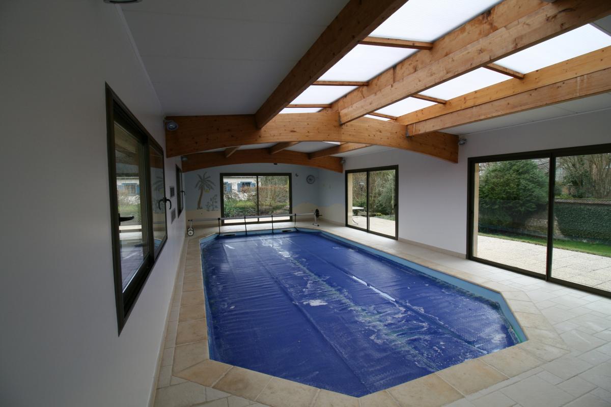 Grande salle de sport de 73 m² avec piscine intégrée, bassin intérieur (coque polyester) 8.5 x 4.1 m, avec chauffage par pompe à chaleur et système de déshumidification. 2 Grandes fenêtres et 3 double portes fenêtres Alu – double vitrage. Accès direct par le salon ou par les terrasses.