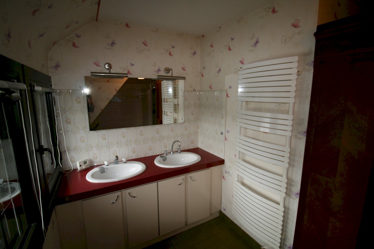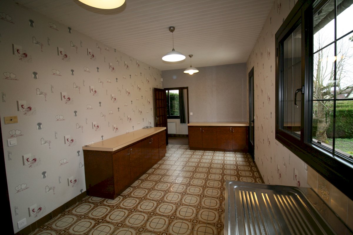 Cuisine de 16.76 m² partiellement aménagée avec fenêtre et porte fenêtre donnant sur terrasse et jardin. Accès direct sur l’entrée, le séjour, l’escalier menant au sous-sol. Accès terrasse.