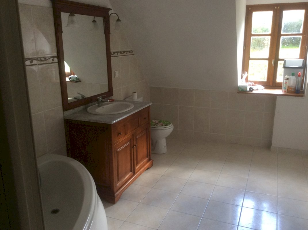 Maison située entre Gavray et Villedieu les poêles en pleine nature. Au Rez de chaussée un salon avec cheminée et poutre apparentes, une cuisine avec cheminée , un scellier et une salle d’eau avec douche et wc. A l’etage trois grandes chambres et une salle de bain avec baignoire et wc. Chauffage central au gaz, assainissement fosse toutes eaux , garage attenant et dépendances. Grande cour fermée par des murs,un puit, terrain de 2 ha dont un verger avec une trentaine de pommiers basse tige, une bergerie. Accès par un chemin communal goudronné. Le diagnostic de performance énergétique et le contrôle de la fosse sont réalisés. L’exposition est plein sud.