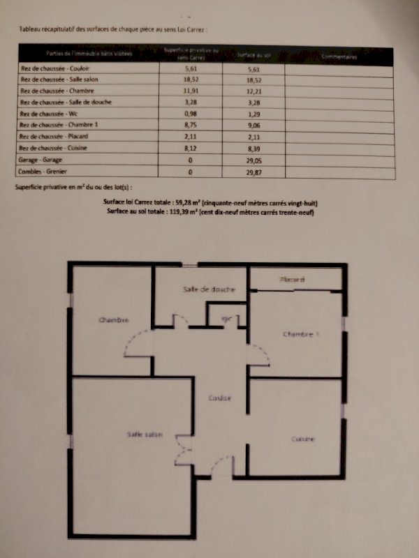 - l’appartement en rez-de-chaussée d’une superficie de 59m2 (voir plan ci-joint) comprend :